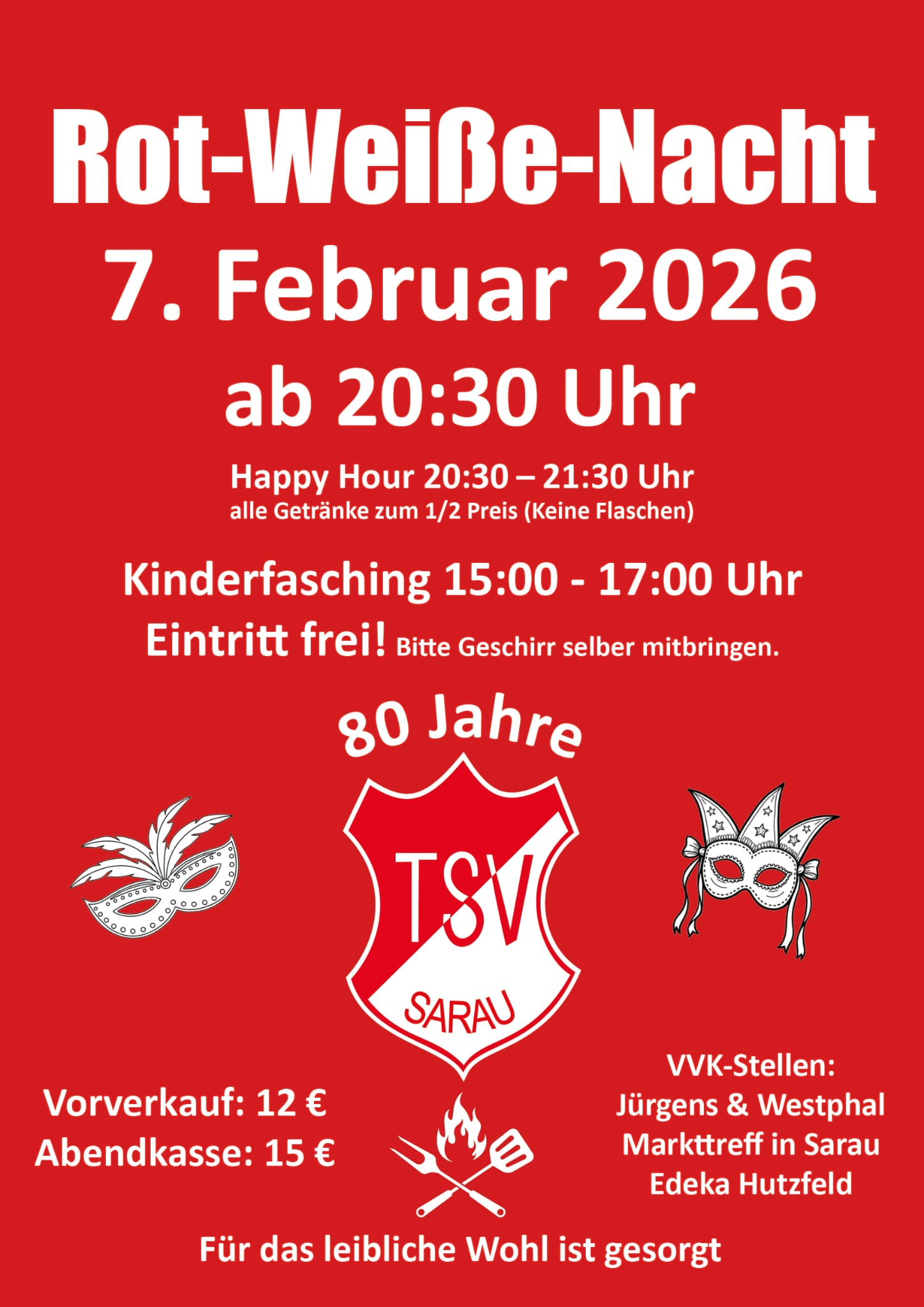 Im Jahr 2026 feiert der TSV Sarau 1946 e.V. sein 80-jähriges Jubiläum – und natürlich darf dabei auch die traditionelle Rot-Weiße-Nacht nicht fehlen!