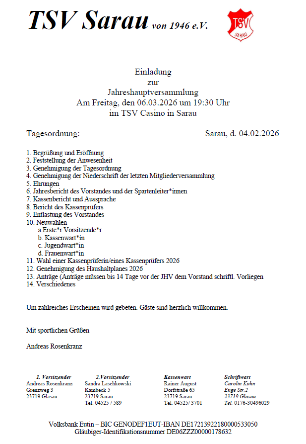 Ein herzlicher Dank gilt allen Übungsleiterinnen und Übungsleitern, Helferinnen und Helfern sowie allen Ehrenamtlichen, die den TSV Sarau im Jahr 2025 mit großem Einsatz unterstützt haben. Mit viel Motivation, Zusammenhalt und Freude am Sport blicken wir auf das neue Jahr und freuen uns auf viele gemeinsame Momente in 2026.